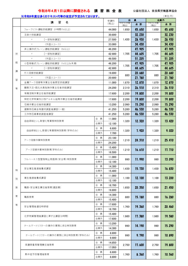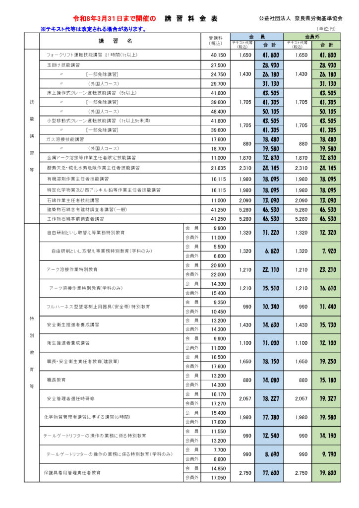 講習料金表